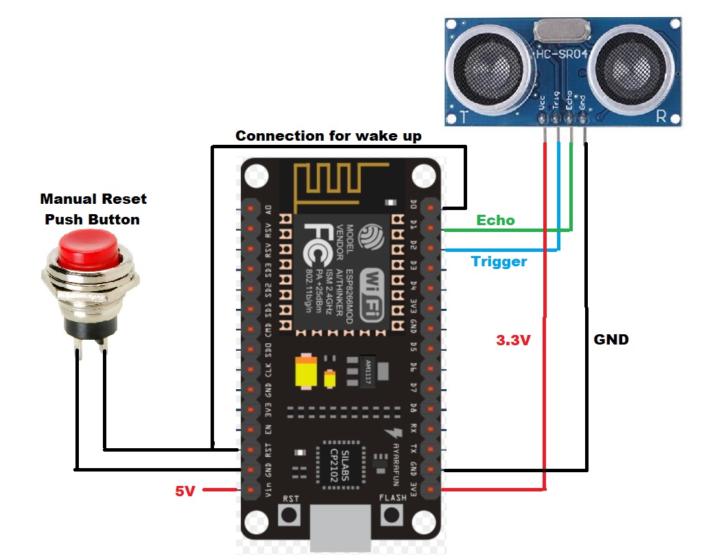 We connect the Trigger pin of the Ultrasonic Module to the GPIO4 Pin (D2) of the NodeMCU and the Echo pin to the GPIO5 pin (D1) of NodeMCU. I also included a reset button which I can use to reset the IoT device manually if needed. It momentarily connects the GND with RST Pin causing the module to reboot. Furthermore the GPIO16 (D0) Pin also needs to be connected to RST Pin, this will send the Wake signal (Low signal/0) to the RST Pin at the end of deep sleep. If this connection is not done the module will not automatically wake up after deep sleep.