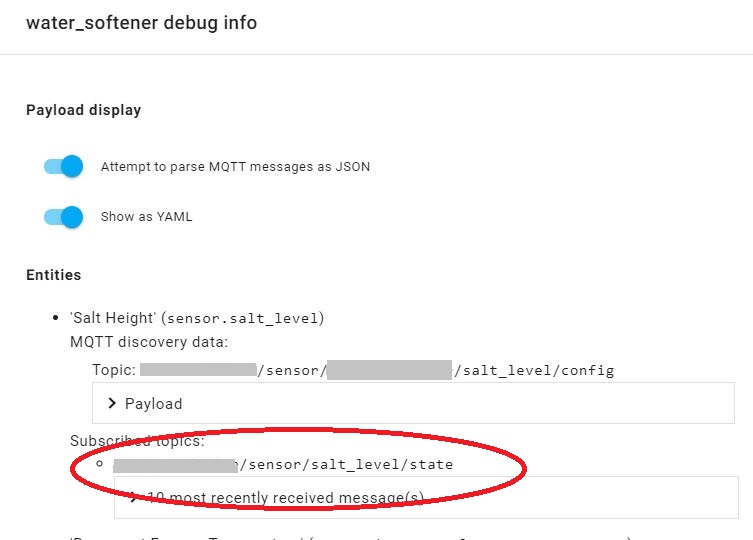 Here under “Entities” you can see the “<ESPHome_Device_Name>/sensor/salt_level/state” topic which the ESPHome device uses to report the salt height (salt level) in inches to Home Assistant. I’m using this MQTT message as an input to calculate the percentage of salt above the brine level and push the output of that back to Home Assistant as another sensor.
