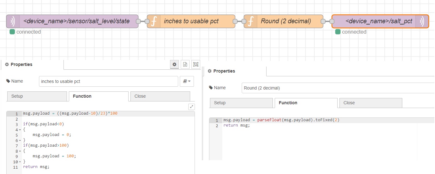 There are some additional steps I did to get the percentage of salt above the brine solution level. I’m using MQTT and Nodered to do this.
